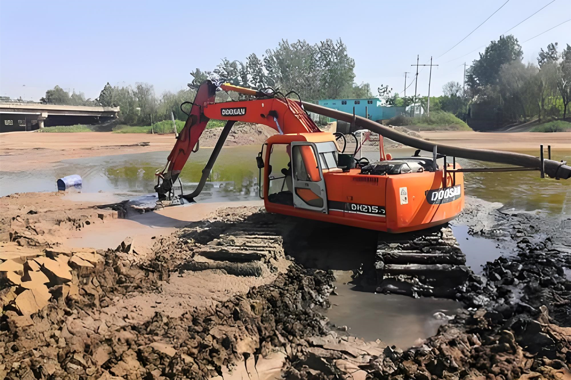 如果魚塘不想放水(比如里面還有魚苗,或者水源不好補充),就用 “水上挖機”。這種挖機底部有浮箱,能直接在水面上作業。
