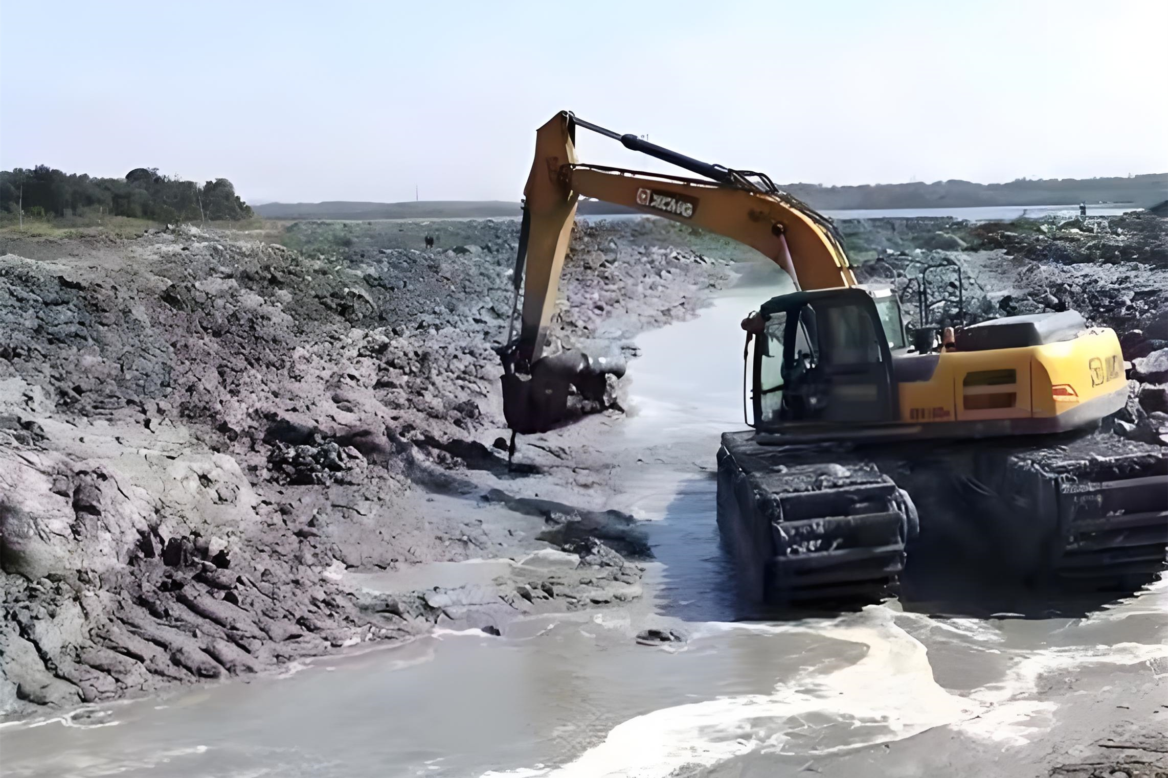 對于流塑狀淤泥(用手抓會從指縫溜走),長臂挖機的優勢更明顯。這種淤泥承載力極差,挖機一旦陷入很難脫困,長臂挖機可以 “遠程作業”,用鏟斗將淤泥扒到岸邊,減少設備與淤泥的直接接觸。同時,長臂的 “杠桿效應” 能更輕松地攪動深層淤泥,配合泥漿泵將其抽排出去。